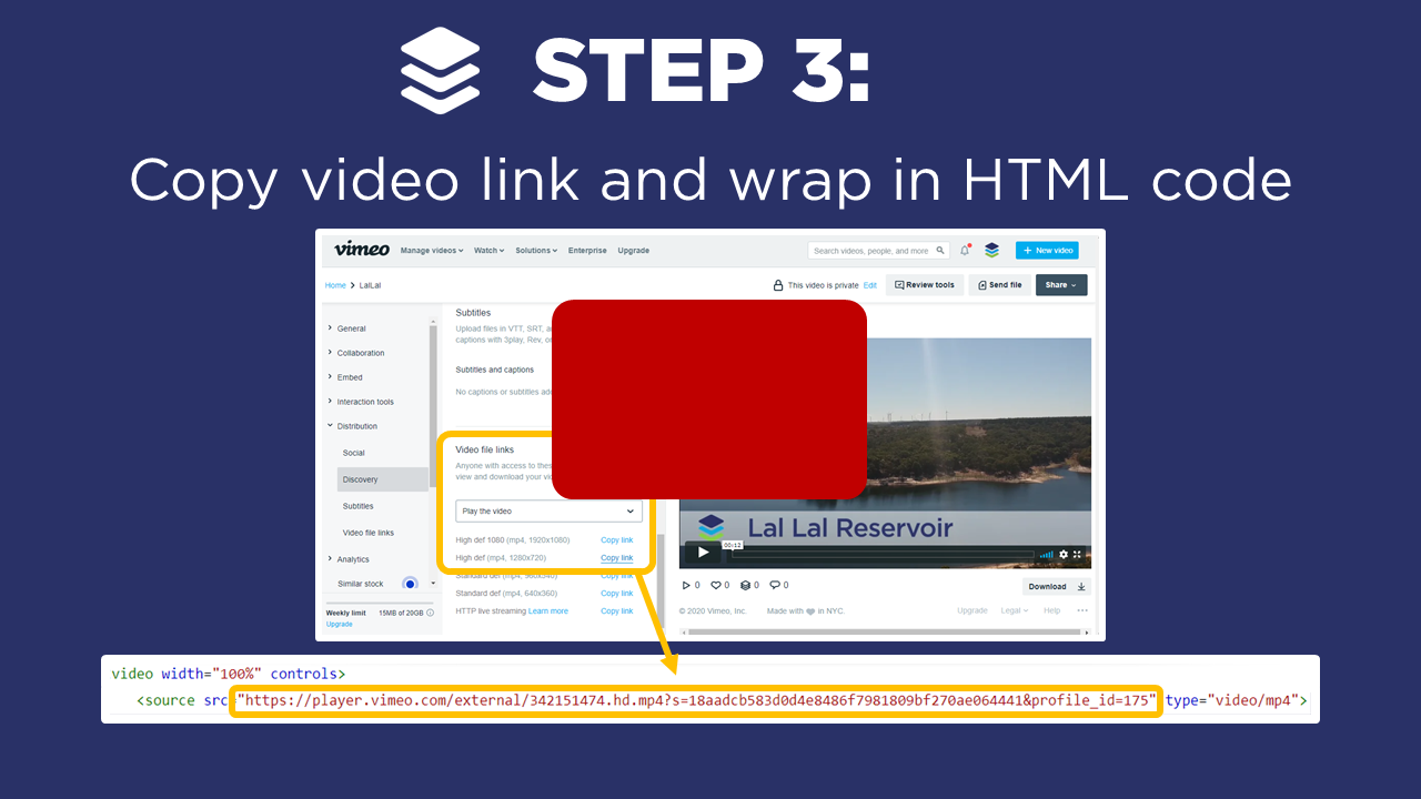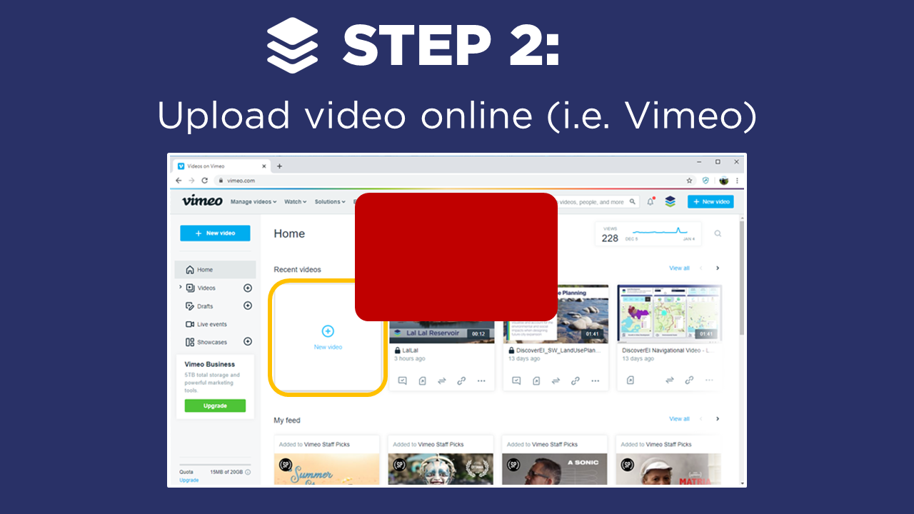 Now that we have created our videos, the next step is to host them online to create our video file links. While there are lots of platforms out there for video hosting, we like to use Vimeo. All you have to do in this step is upload your video online!