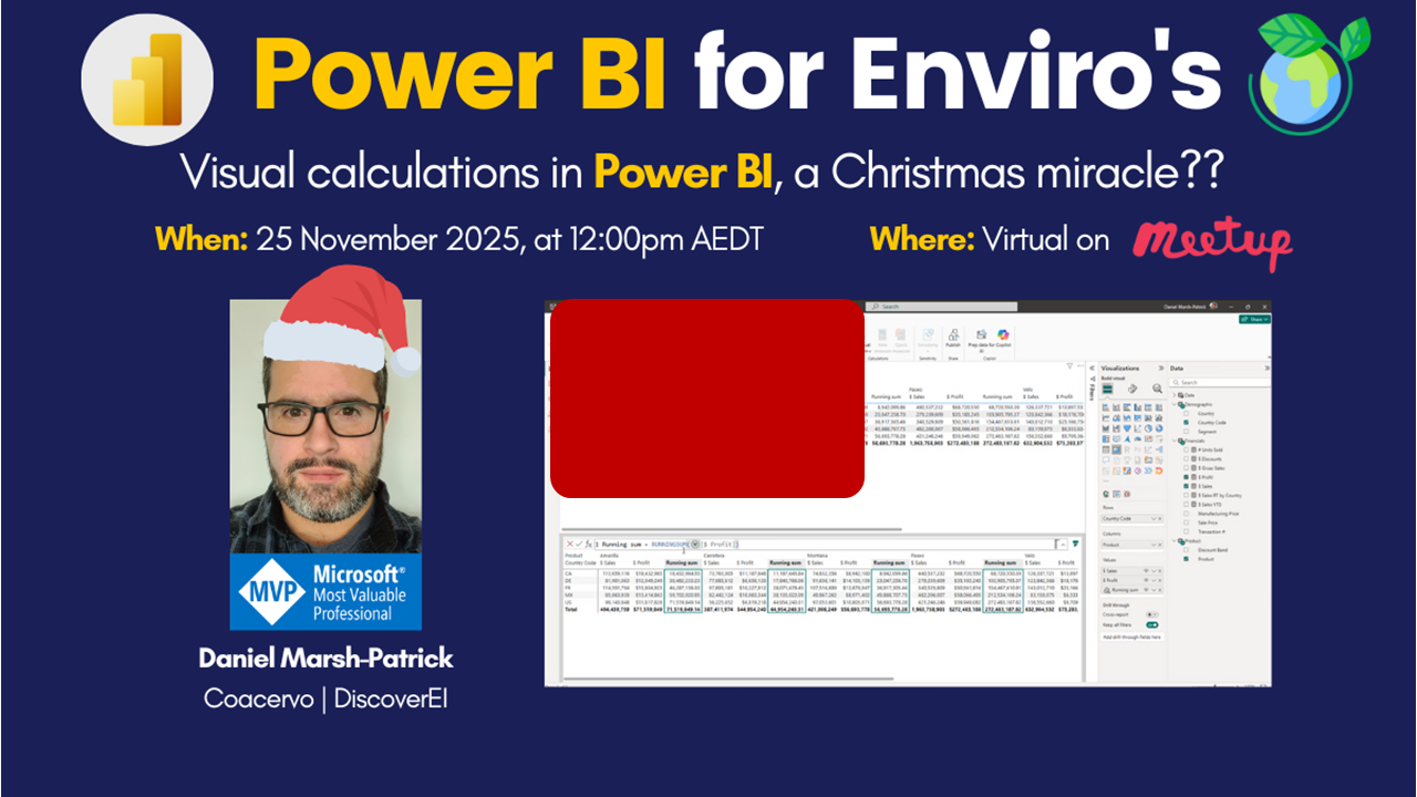 Sign up now for the meetup here: https://www.meetup.com/en-AU/powerbi4enviros - and if you have ideas for a future session then please let us know at info@discoverei.com .